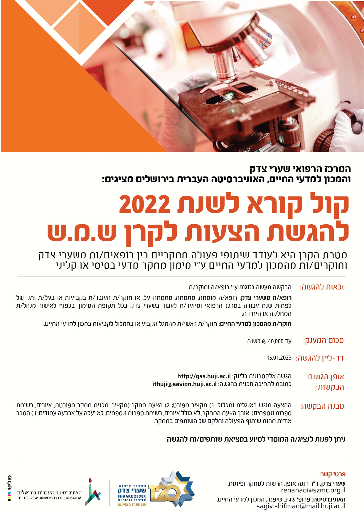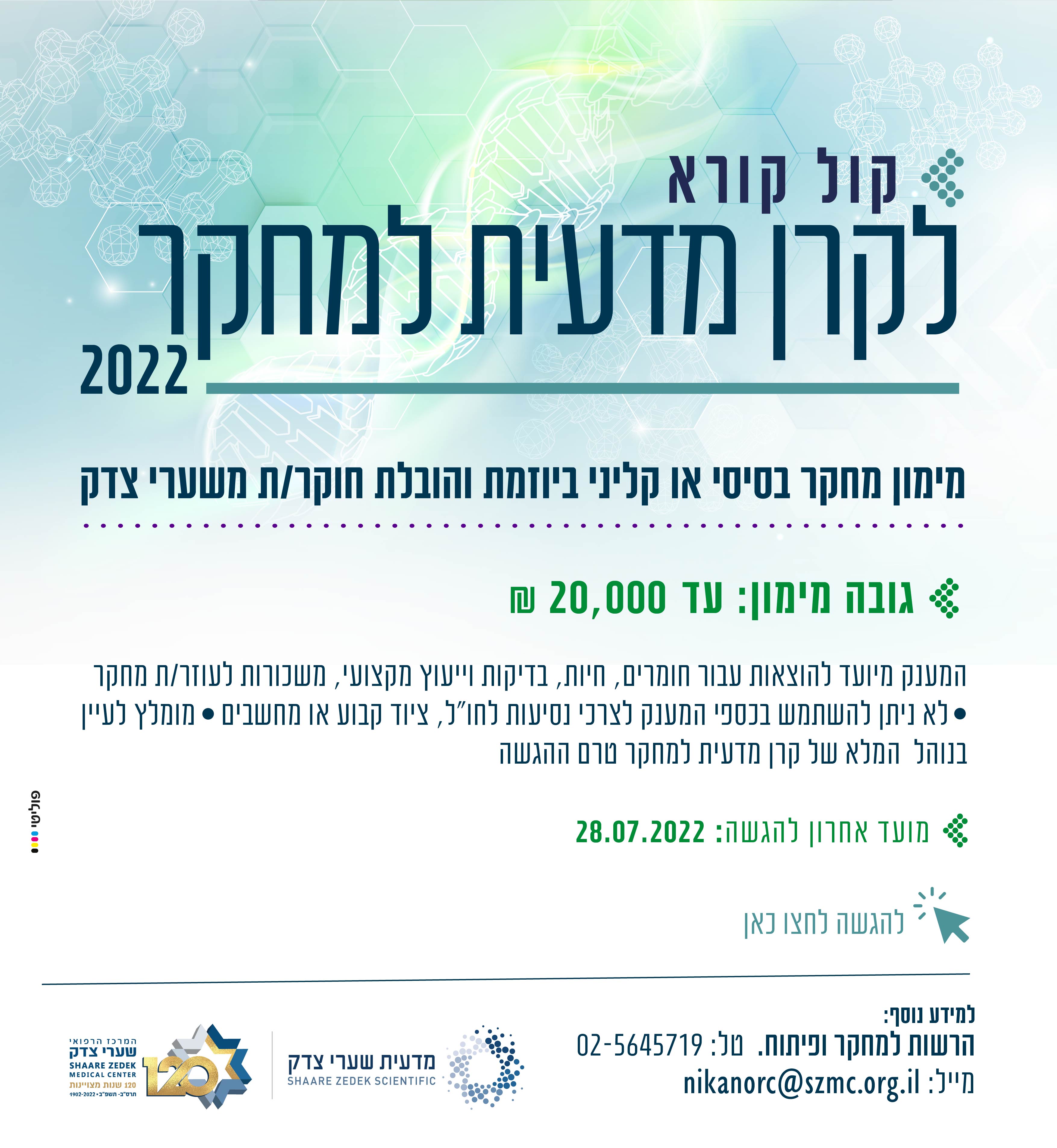 קרן פנימית של המרכז הרפואי שערי צדק שמטרתה לתמוך ולקדם מחקר עצמאי קליני שנערך ע"י חוקרי בית החולים. 20,000 ₪ מוענקים ל 20 הצעות מחקר מדי שנה.