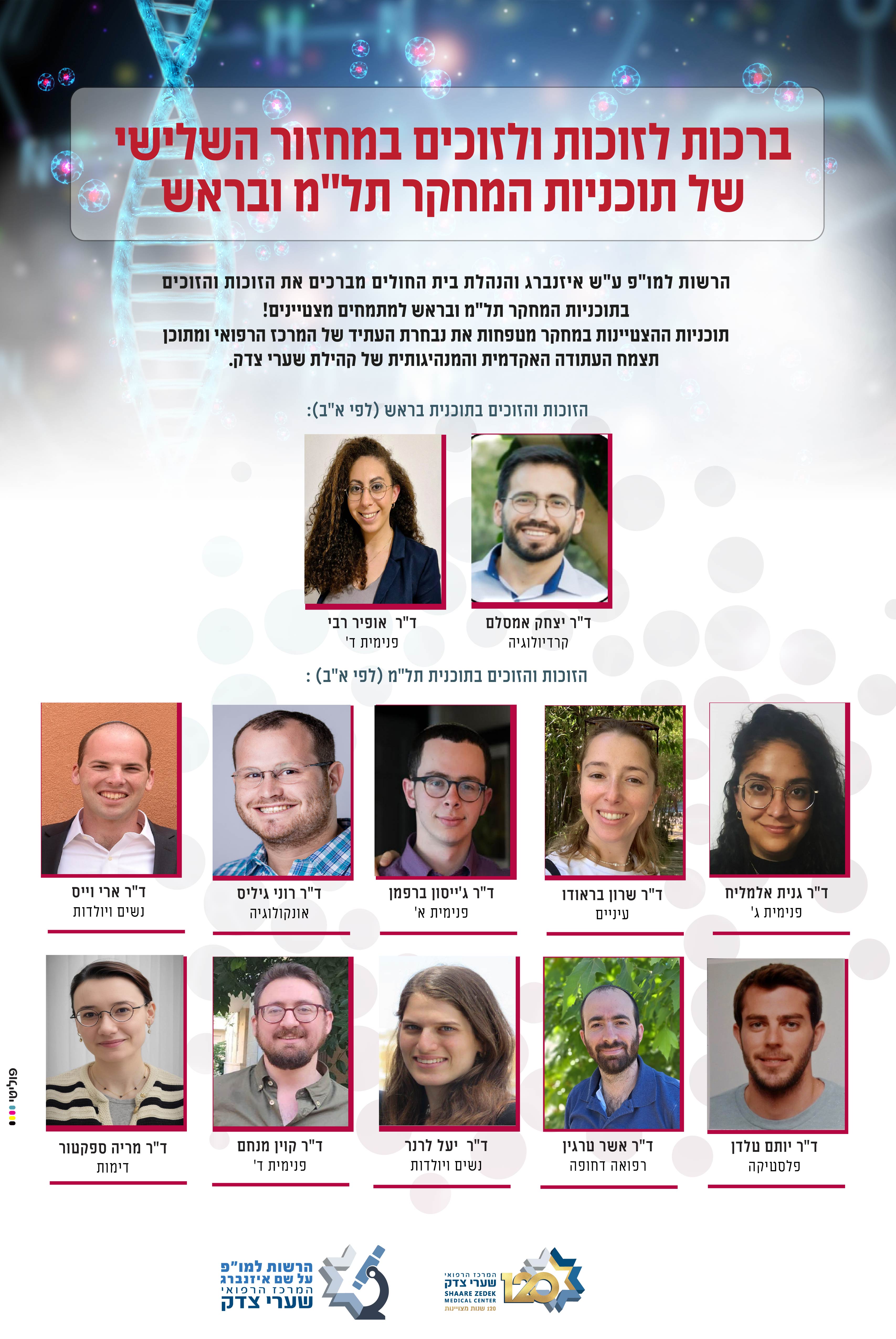 תכנית למתמחים/ות מצויינים/ות במרכז הרפואי שערי צדק. התוכנית נועדה לחשוף מתמחים/ות בעלי פוטנציאל מצויינות למחקר קליני, בדגש על שילוב בין מצויינות קלינית ופיתוח יכולות מחקריות. המשתתפים בתוכנית יקבלו תקציב שנתי של 20,000 ₪ למשך שלוש שנים, מנטורינג וליווי אישי, וזמן מוגן לביצוע המחקר.