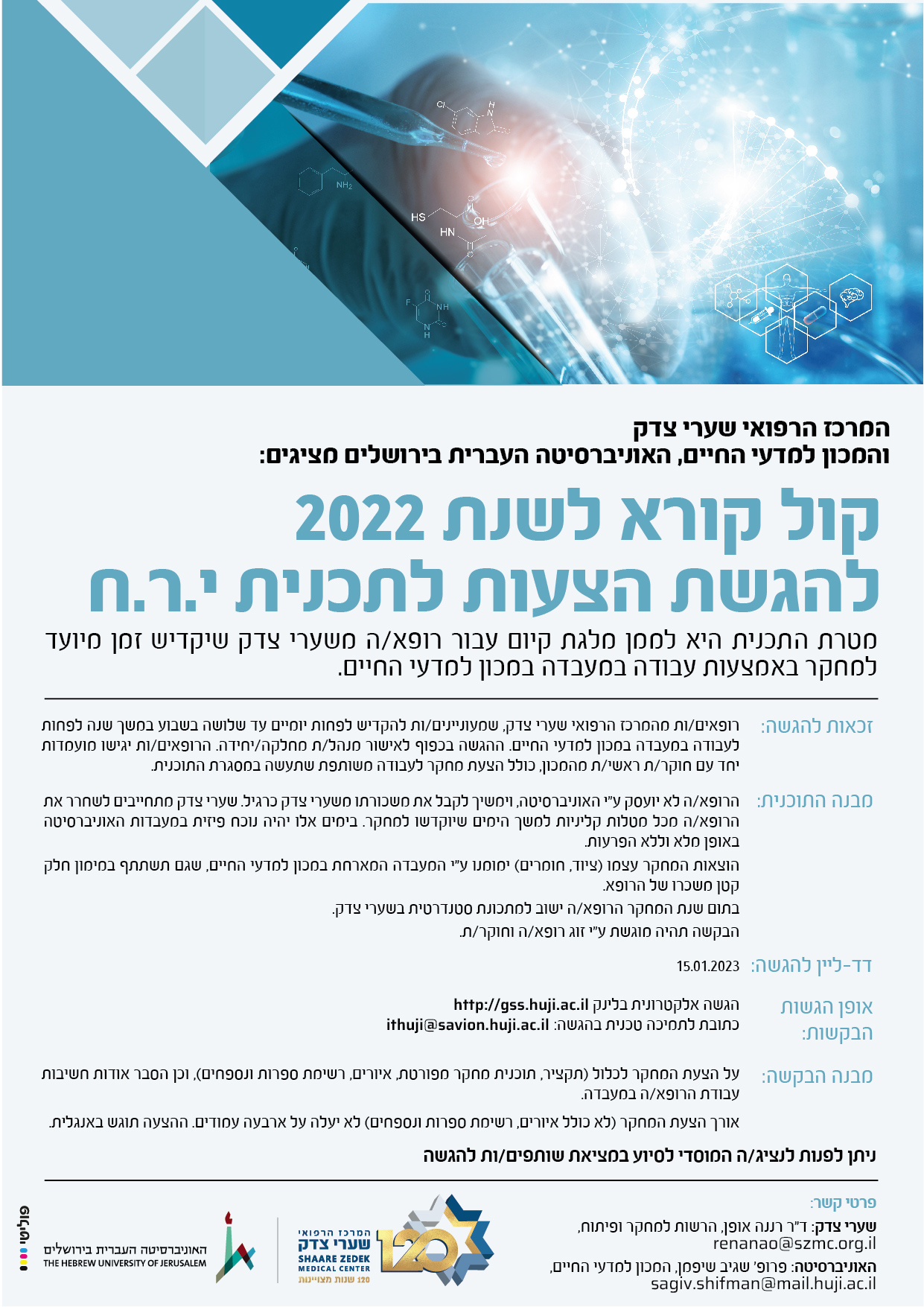 תכנית קידום רופאות/חוקרות ורופאים/חוקרים מצטיינים במרכז הרפואי שערי צדק. התוכנית נועדה לפתח רופא/ה-חוקר/ת מצטיין, בדגש על שילוב בין מצוינות קלינית ומחקרית. משתתפים בתוכנית יקבלו תקציב של עד 100,000 ₪ לשנה ל-3 שנים, ליווי אישי ומטורינג, וזמן מוגן לביצוע המחקר.